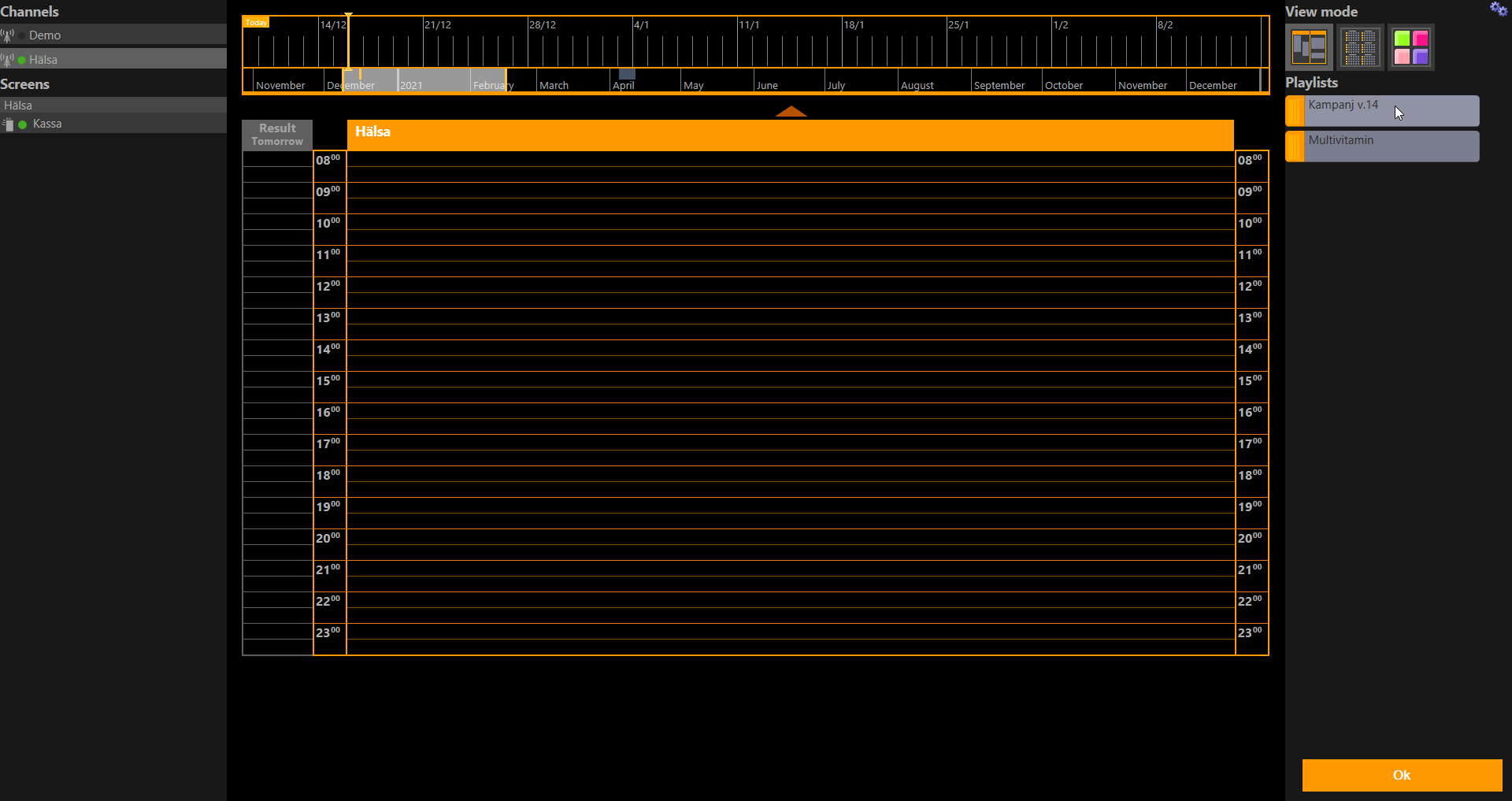 När du har öppnat Schemaläggaren så kommer du till dagsvyn. Här planeras vid vilka tidpunkter olika spellistor kommer att spelas på de olika kanalerna och skärmarna.