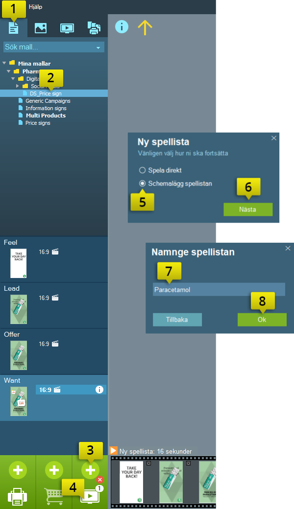 1. Välj Mallfliken 2. Välj mall 3. Klicka på plus-ikonen för att Lägga till kö 4. Klicka på skärmikonen för att Skicka till skärm 5. Välj Schemalägg spellistan 6. Klicka på Nästa 7. Ge spellistan ett namn 8. Klicka på Ok