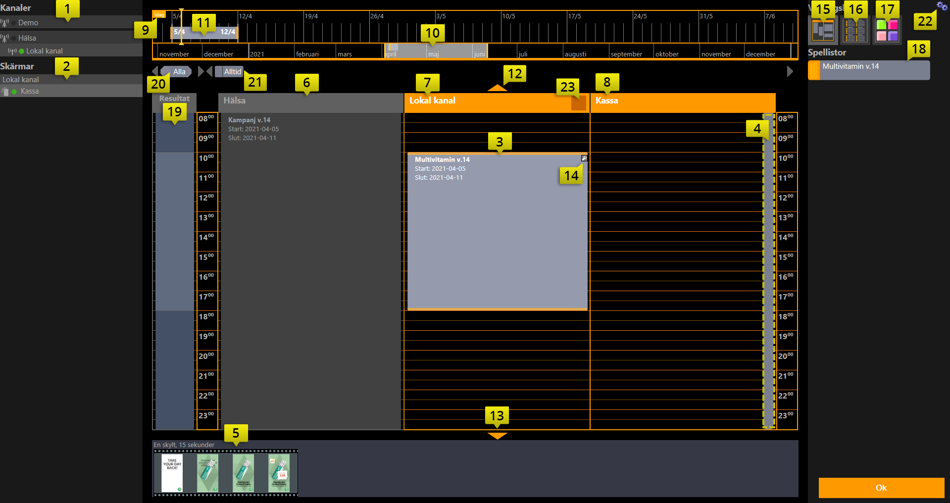 1. Kanaler 2. Skärmar 3. Aktivitet 4. Omedelbar spellista 5. Vald aktivitet eller omedelbar spellista 6. Ärvd kanal 7. Lokal kanal 8. Skärm 9. Ta mig till dagens datum 10. Månadsintervall 11. Datumintervall 12. Scroll upp till midnatt 13. Scroll ner till kl.23 (visas när du klickat på scroll upp till midnatt) 14. Aktivitetshanterare – skiftnyckel på aktivitet 15. Dagsvy – den du ser just nu 16. Månadsvy 17. Periodvy 18. Aktuella spellistor 19. Resultat – av alla kanalers innehåll, som visas på skärm just nu (håll muspekaren över fälten) 20. Kundgrupper/Butiksgrupper - Begränsa spellistans synlighet till en viss butiksgrupp 21. Perioder - Begränsar vilka dagar inom spellistans datumspan som spellistan är tillgänglig 22. Inställningar 23. Spellista som visas när inget material är skickat. Dra och släpp din spellista i rutan för att använda funktionen OBS. Rutan blir synlig när du markerar en spellista och drar den in och över den dolda rutan: