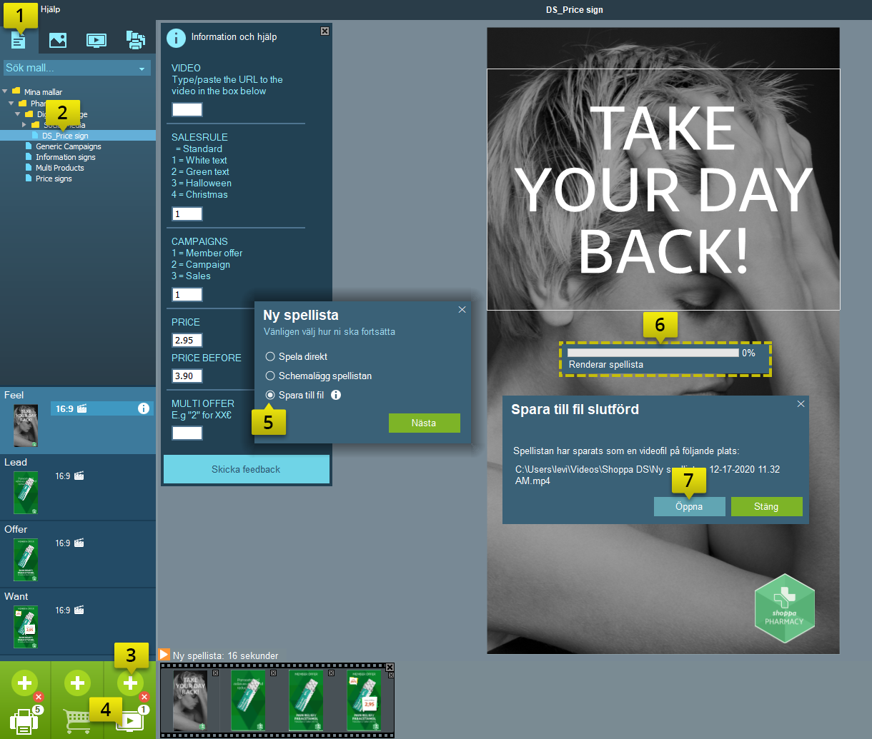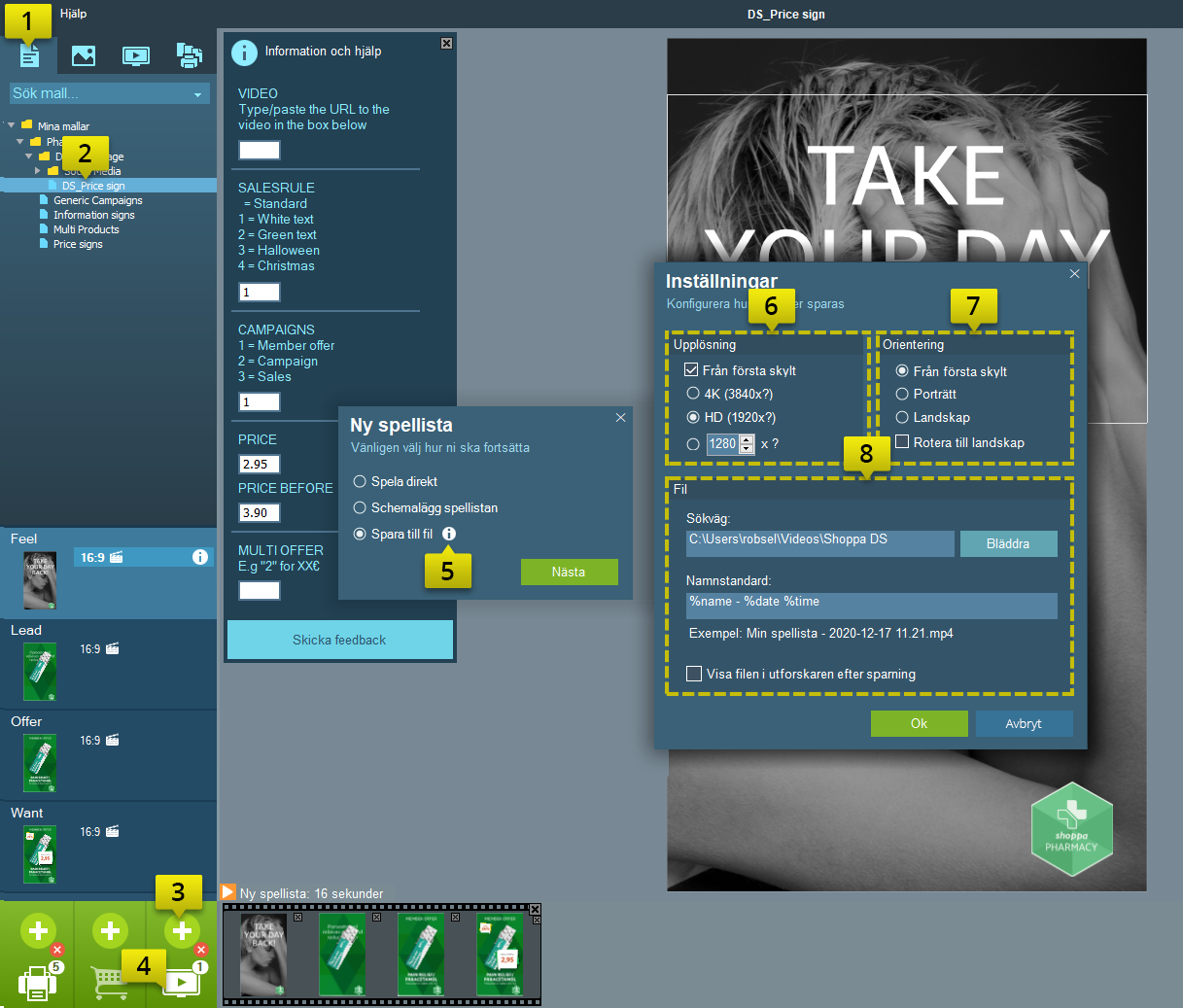 Funktionen Spara till fil ger dig möjlighet att spara din spellista till en videofil (.MP4). Funktionen kräver att ett addon - DSSaveToFile - aktiveras på ditt konto. Ingår du i en kedja kontaktar du ditt huvudkontor/servicekontor. I annat fall kontaktar du din säljkontakt på Shoppa alternativt sales@shoppa.com.